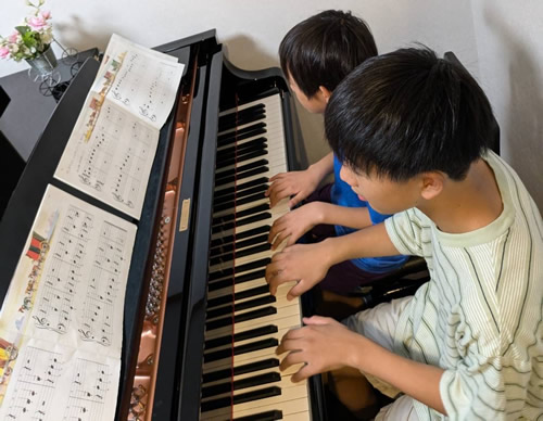 「ピアノが弾ける様になる」という事は様々な力を必要とします。読譜力、リズム感、拍子感、和声感、フレージング力、調性感、曲想、無理な力を入れずに弾く打鍵法etc.それらの大事な音楽の基礎力を、当教室は、一人一人の成長や個性に合わせ、教材やワーク選び、時には連弾や音符カード、講師特製もんだい、伴奏付け、聴音、打楽器でのリズム打ちetc.などを通して、無理なく培っていきます。