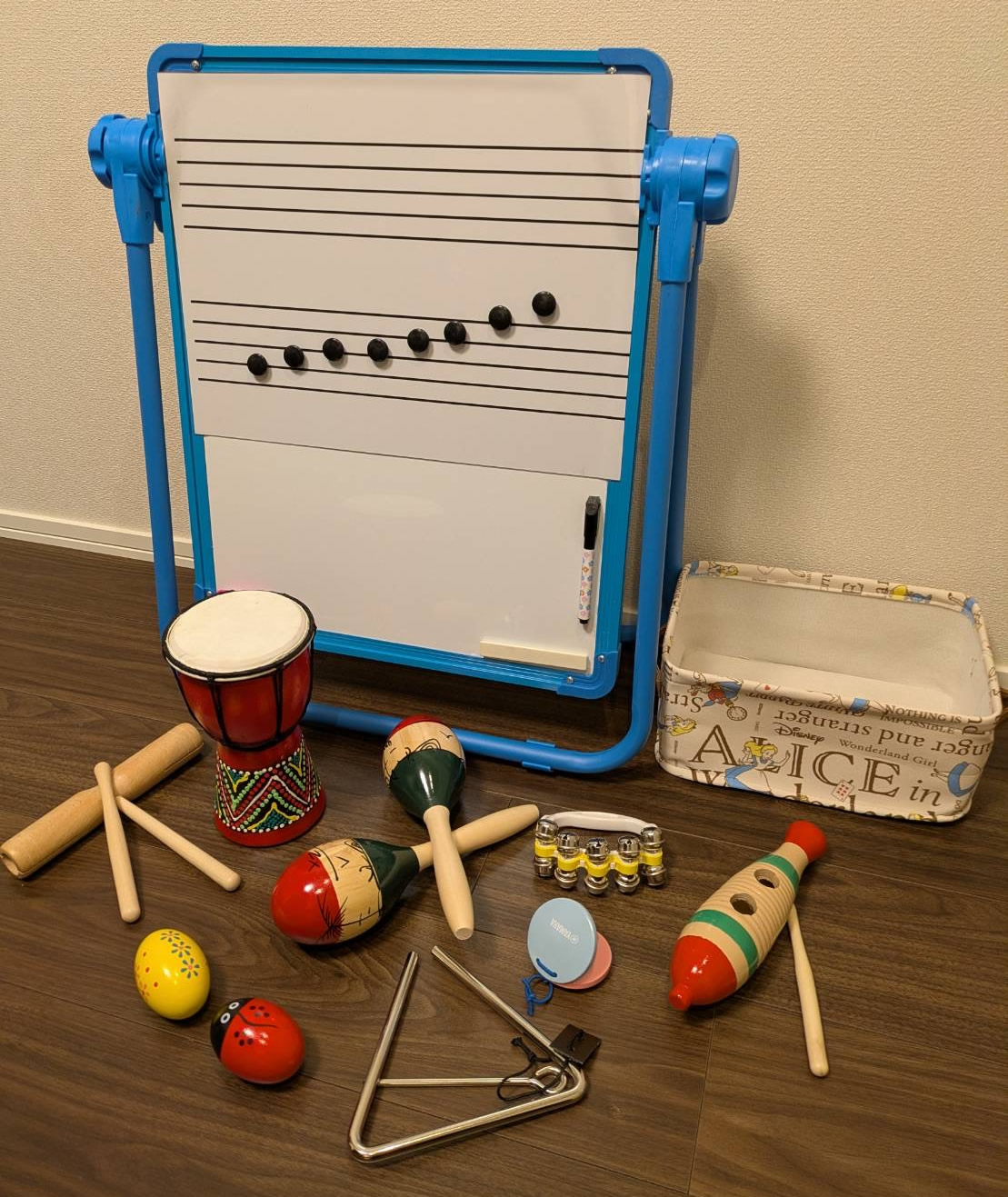 まず「音楽を感じる心」を大切に、大抵レッスンの始めに講師のピアノ伴奏で、その季節にちなんだ歌詞唱、リズム奏をしております。目的は大きく分けて2つ。